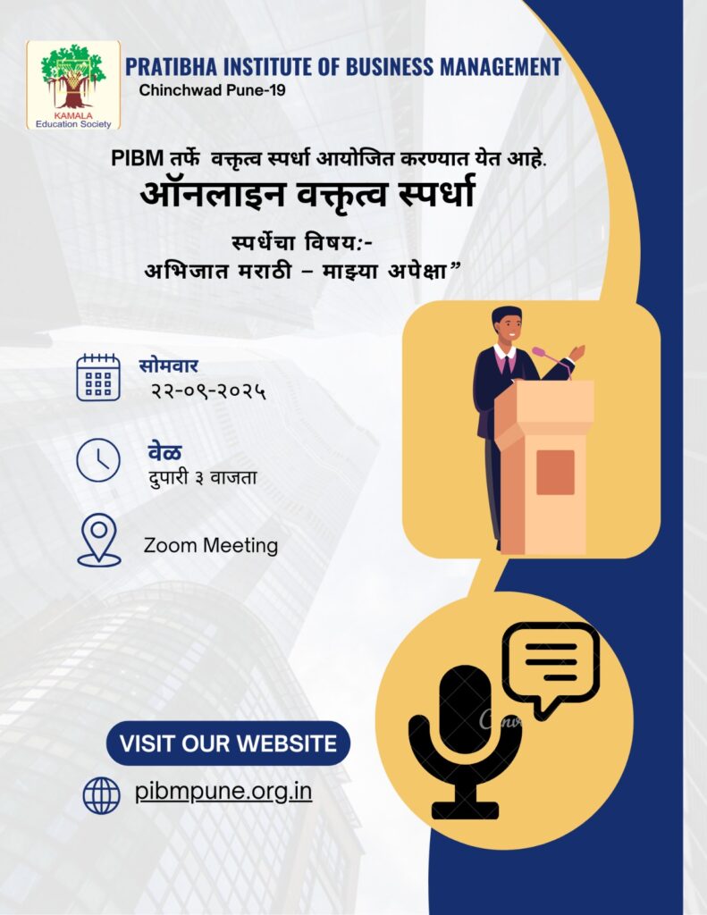 PIBM तर्फे ऑनलाइन वक्तृत्व स्पर्धा आयोजित करण्यात येत आहे. स्पर्धेचा विषय आहे : "अभिजात मराठी – माझ्या अपेक्षा" 🗓 दिनांक व वेळ : २२ सप्टेंबर, दुपारी ३:०० वा. 💻 प्लॅटफॉर्म : Zoom (मीटिंग लिंक व तपशील पुढील सूचना मध्ये दिले जातील) 👉 सहभागी होऊ इच्छिणाऱ्या विद्यार्थ्यांनी आपले नाव उद्या दुपारी २ वाजेपर्यंत कविता मॅडम यांच्याकडे नोंदवावे. ही स्पर्धा तुमच्या वक्तृत्व कौशल्याचे सादरीकरण करण्याची तसेच मराठी भाषेबद्दल आपली भूमिका मांडण्याची उत्तम संधी आहे. आपल्या उत्साही सहभागाची अपेक्षा आहे. – PIBM MCA Department